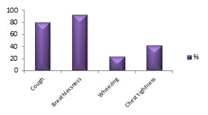 The most common presenting complaint among the study patients was breathlessness (92.66%) followed by cough (79.66%), chest tightness (23.16%) and wheezing (23.16%). Figure 1: Distribution of patients according presenting symptoms Table 4: Distribution of patients according duration symptoms