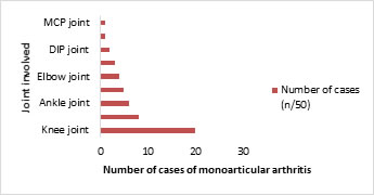 DISCUSSION Total 50 patients with acute or chronic onset symptoms of mono-articular arthritis were studied. Data was analyzed for etiology of mono-articular arthritis. Mean age at onset of arthritis symptoms was 35 years with maximum cases (28/50) 56% in the age group of 22 to 55 years. Male and female patients were 30 (60%) and 20 (40%) with male to female ratio of 1.5:1 which explains slight male preponderance in mono-articular arthritis. According to previous study by Windisch et al3, mean age at the onset of symptoms was 39 years, with 51% of patients presenting in the range between 20 and 40 years. Also Windisch et al3study showed male preponderance (56%) which is comparable to our study (60%). Based on etiology male preponderance is seen in septic arthritis, tubeculous arthritis, seronegative spodyloarthropathy, osteoarthritis and gout as studied before.3,4 In our study, we found 24 (48%) cases of acute mono-articular arthritis and 26 (52%) cases of chronic mono-articular arthritis which suggest chronic mono-articular arthritis more common than acute. Duration of symptoms at presentation varied from a minimum of 3 days to maximum up to 5 years with most in the range of 2 months to 1 year. As shown in Chart 1, joint pain or tenderness was main presenting feature of mono-articular arthritis seen in 44 (88%) patients followed by swelling or tenderness of joint in 34 (68%) patients and limitation of joint movement in 28 (56%) patients. History of morning stiffness lasting more than one hour was seen in 28 (56%) patients which were of inflammatory type of arthritis. Systemic features like fever, generalized body ache fatigue, anemia, lymphadenopathy, rash, serositis, weight loss and Reynaud’s phenomenon were present in (18) 36% cases. Fatigue, generalized body ache and fever was common in patient with inflammatory type of arthritis such as rheumatoid arthritis, seronegative arthropathies, juvenile idiopathic arthritis and crystal induced arthritis (gout). The knee joint mono-articular arthritis was present in 20 (40%) patients with other joints involved in decreasing frequency were, hip joint, ankle joint, shoulder joint, elbow joint, MTP joint, DIP joint, sternoclavicular joint, MCP joint (Chart 2). Previously joint involvement has been studied according to the etiology of arthritis and not as mono-articular arthritis which revealed that knee is the commonly affected joint in different etiologies. Irrespective of the etiology of arthritis, knee joint was most commonly involved in mono-articular arthritis. As per the available literature5,6 most commonly involved joint in septic arthritis is knee (50%), followed by hip (20%), shoulder (8%), ankle (7%) and wrist (7%). The elbow, interphalangeal, sternoclavicular, and sacroiliac joints each make up 1.4% of cases.5Siu Fai Li et al studied 92 cases of septic arthritis out of which 42 cases had knee joint arthritis followed by 11 to 6 cases for shoulder and hip joint respectively.7 Previous study on septic arthritis describes non-gonococcal septic arthritis is generally mono-articular (80 percent of cases) and most often affects the knees (50 percent of cases).8 A study report in osteoarticular, tuberculosis, 50% of the cases involves spine; hip and sacroiliac joint, 12% to 15%, knees, 10% ribs, 10% shoulder,7% ankle, 7% elbow, 2% and wrist 2%.9Hence this study supports the knee joint as commonly affected extra-axial joint in mono-articular arthritis. In a detailed report of bone and joint TB in Saudi Arabia, El Titi et al9 reviewed 68 cases in Riyadh that involved the spine in 57% of the cases; knee was affected in 14% followed by the hip in 10% of the cases.9 Harrison’s principles of internal medicine mentions that approximately 30% of patients with psoriatic arthritis have asymmetric oligo-arthritis commonly involving knee or another large joint with a few small joints in the fingers or toes and osteoarthritis is the most common cause of chronic knee pain in persons over age 45. With the supporting evidence of literature we conclude knee as most commonly affected joint in mono-articular arthritis. On the basis of etiology, all cases were categorized into four main classes (Table 1) as idiopathic arthritis, infectious arthritis, inflammatory and non-inflammatory arthritis. Inflammatory arthritis was further classified as crystal induced arthritis (gout), seronegative spondyloarthropathy, rheumatoid arthritis, juvenile idiopathic arthritis, osteoarthritis, and pigment induced arthritis and chronic hypertrophic synovitis. Infectious arthritis was most common etiology of mono-articular arthritis comprising (n=15) 30% cases. In infectious arthritis, 10% (n=5) cases were of tuberculosis etiology and remaining 20% were due to staphylococcal aureus (n=4) and Burkholderia pseudomallei, Streptococcus viridans, S. pneumoniae and Pseudomonas aeruginosa. By etiopathogenesis, inflammatory arthritis was most common type of mono-articular arthritis comprising 44% cases, 30% cases of infectious arthritis, 18% cases of idiopathic arthritis and 8% cases of non-inflammatory type of mono-articular arthritis. Considering single etiology, idiopathic arthritis was most common diagnosis (18%) in patients presenting for first time with monoarticular arthritis. Tuberculous arthritis patient were presented with chronic onset symptoms varying from 4 weeks to 2 years. All infectious arthritis cases required interventions like joint fluid aspiration or synovial biopsy. Two cases required synovial biopsy for diagnosis of tuberculous arthritis. Remaining 10 cases of infectious arthritis (Table 1) due to Staphylococcus aurous, Burkholderia pseudomallei, Streptococcus viridans, S. pneumoniae and Pseudomonas aeruginosa were positive on culture of the joint fluid. The available studies on mono-articular arthritis also described infections as most common cause of arthritis followed by crystal induced arthritis.11 According to literature, three main etiologies to be consid