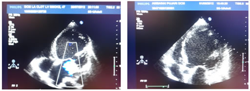 In present study, left ventricular dimensions were less but all patients had global hypokinesia and poor ejection fraction. LVPW and IVS thickness was within normal limits. Right ventricular dilatation was seen in 20 (40%) of patients and mean right ventricular diameter was 22.84 ± 7.20 mm. Left atrial enlargement was seen in 27 (54%) patients and mean LA diameter was 40.94 ± 6.30 mm. Valvular regurgitation was seen in 43 (86%) of patients. There was isolated MR in 12 (24%) of patients, while MR was associated with TR in 26 (52%) patients and with TR and AR in 4 (8%) patients. There was isolated TR in 1 (2%) patient. Diastolic dysfunction was present in 21 (42%) patients in the present study. Pericardial effusion was present in 15 (30%) patients. In 5 (10%) patients, clots were detected (Table 4 and 5) (Fig. 1 and 2).