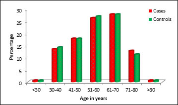 Figure 1: The age distribution of cases and controls is depicted in Table 1. The mean age (in years) of 140 cases was 57.06±12.77and that of 140 controls was 56.67±12.70Samples are age matched with P=0.800, Student t test.