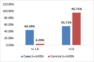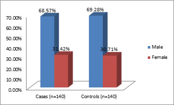 Out of 140 cases, 96 (68.57%) were males and 44 (31.42%) were females. Out of 140 controls 97 (69.28%) were males and 43 (30.71%) were females and it was not significant. (‘p’ = 0.4) (Table 2)