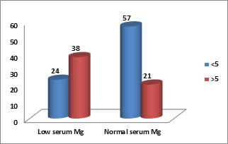 This table is showing there are 24 diabetic patients out of 81 diabetic patients having low serum magnesium whose duration of diabetics is <5 and 38 diabetic patients out of 59 diabetic patients having low serum magnesium whose duration of diabetes is >5 years. Longer duration of diabetes has statistically significant influence on low levels of serum magnesium in diabetic subjects under study. (X2=15.353, R.R=0.46; ‘p’<0.0001) Applying chi square test, ‘p’<0.0001, shows significance