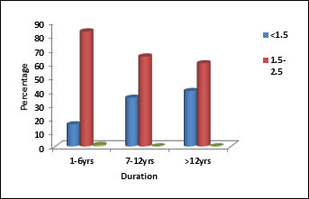 The mean serum magnesium level was maximum in patients with lesser duration of illness (1-6 years), while that was minimum (1.53 ± 0.19) in patients with duration of illness more than 12 years. This difference was statistically significant (‘p’ < 0.001)