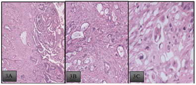 CASE REPORTS A 45 year old female presented with chief complaints of pain abdomen, non bilious, non projectile vomiting, yellowish discolouration of the skin and eyes with high colouredurine for one month. She also complained of itching over the body. Physical examination revealed presence of icterus and tenderness in the right hypochondrium. A clinical diagnosis of obstructive jaundice was made. No history of any comorbid conditions present with past surgical history of hysterectomy. After routine blood investigations, which revealed increased bilirubin levels, radiological investigations done. Ultrasound of abdomen was performed which showed CBD stricture at the terminal end, grossly thickened gallbladder and peripancreatic lymphadenopathy. Side viewing UGI scopy was done which was normal. To further characterize the ultrasound findings, CECT abdomen was done which showed wall thickening (maximum thickness of 8 mm) noted involving the fundus and body of the gallbladder, irregular and nodular, more on the right lateral aspect with evidence of heterogenous enhancement seen on contrast administration.[Fig-1A] There is no clear fat plane seen between the gall bladder and the liver (segment IV and V), however there is no extension into the liver. Pericholecystic fat stranding seen and minimal pericholecystic fluid seen. Medially it is seen to abut the pylorus of the stomach and first part of the duodenum with no clear fat plane. Posteriorly there are areas of fat stranding seen extending up to the hepatic flexure of the colon. Also there was gross dilatation of the intrahepatic biliary radicles, the common hepatic duct, cystic duct and proximal common bile duct ( measuring 2.4 cm).There is an abrupt tapering at the junction of the mid and distal CBD duct ( just above the intrapancreatic segment) with suggestion of shouldering. [Fig-1B].There is short segment wall thickening (maximum thickness of 4.2 mm) noted in the distal CBD (intrapancreatic segment) for length of approximately 1.7 cm showing enhancement on contrast administration. The distal most CBD and the ampulla were spared. The rest of the intrapancreatic segment of the common bile duct appears normal. This thickening was seen well away from the gall bladder mass. There was no radiological evidence of contiguity noted. MR-Cholangiopancreaticography was done which showed an assymetrical wall thickening involving fundus and body of gall bladder with abuttment of adjacent liver and no infiltration [Fig-2A].Few stranding from the GB wall thickening to the hepatic flexure is seen. Abrupt narrowing with shouldering in the proximal CBD just after insertion of cystic duct and resultant severe upstream dilatation of biliary system [Fig-2B] A pre-operative diagnosis of gall bladder carcinoma with separate CBD involvement was made with possible diagnosis of same primary with skip involvement or synchronous malignancies. Then patient was subjected for pancreaticoduodenectomy [whipples procedure]. Post operative histopathology of the specimens revealed moderately differentiated adenocarcinoma of both gallbladder [Fig-3A] and the distal CBD [Fig-3B]with signet cell formation [15%] [Fig-3C].Margins free of tumour. Figure 1A: CECT whole abdomen, coronal venous phase shows- Irregular and nodular heterogenous enhancingwall thickening involving the fundus and body of the gallbladder,, more on the right lateral aspect. Medially it is seen to abut the pylorus of the stomach and first part of the duodenum with no clear fat plane. Figure 1B: CECT whole abdomen, sagittal venous phase shows- gross dilatation of the intrahepatic biliary radicles, the common hepatic duct, cystic duct and proximal common bile duct with abrupt tapering at the junction of the mid and distal CBD duct ( just above the intrapancreatic segment) with suggestion of shouldering; Figure 2A: T2 haste MRCP coronal image shows assymetrical wall thickening involving fundus and body of gall bladder with abuttment of adjacent liver and no infiltration; Figure 2B: T2 3D-MRCP shows abrupt narrowing with shouldering in the proximal CBD just after insertion of cystic duct and resultant severe upstream dilatation of biliary system. Figure 3: Primarygall bladder cancers are rare and they often spread via direct invasion or lymphnode. Radiologically malignant appearing biliary strictures with primary carcinoma gall bladder are less reported Most are thought to be associated with pancreaticobiliary maljunction (PBM) owing to the action of the same carcinogen on the mucosa of the entire extrahepatic biliary system[4].With regard to biliary cancer cases without PBM, the presence of skip phenomenon, poses the question of whether differentiation between independent primary cancers has occurred or different cancer foci have metastasized from a single tumour. From a clinical viewpoint, differentiation between these events is important becausethese two mechanistic origins imply various stages of the disease, as well as different subsequent treatments and prognoses3 There are two competing hypotheses for explaining the pathogenesis of double cancers of the biliary tract - independent primary lesions (multicentric) or metastasis of the original cancer. In reality, however, determining whether double cancers are metastases or independent tumours can prove difficult1 Hirroshige Hori et al, reported a series of four cases of simultaneous double cancers of the biliary tract without PBM and compared several characteristics of these tumours, including immunohistochemical evaluation of CEA, CA 19-9 and p53 over expression, as well as identification of mutations in K-ras. The results reported suggested that most double cancers of the biliary tract have multicentric development, even in the absence of PBM1. Praveer rai et al, reported a case of ampullary carcinoma associated with gall bladder carcinoma2