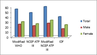 Our study showed prevalence of metabolic syndrome varying from 46.95% (IDF), to 69.76 % (Modified NCEP ATPIII), by different criteria, in newly detected DM type 2 individuals. Prevalence of MS was 55.81% and 63.95 % according to NCEP ATP III, and modified WHO respectively. Study conducted by Ethiraj Dhanraj et al, showed prevalence of patients predicting MS in newly detected DM -type 2 was 64.47%, 56.83%, 67.85%, 62.34% according to modified WHO, NCEP ATP III, modified NCEP ATP III, IDF respectively. Almost similar percent of patients predicting MS seen in this study except the variation result was seen in IDF criteria. Carole et al, study using modified WHO,, NCEP ATP III and IDF criteria showed 38 %, 61%, and 54 % respectively. Thus comparing this study results were almost equal in respective NCEP ATP III, and IDF criteria. But difference was seen with modified WHO criteria. Charles et al study was predicting 43.5 % of MS according to NCEP ATP III criteria in newly detected type 2 DM where as our study is predicting 55.81% of patients. Caroles et al study was predicting less number of MS in newly detected DM patients according to modified WHO (41.3%), NCEP ATP 111(48.7%) criteria, when compared to our study with the same criteria.