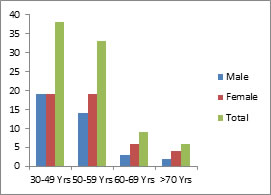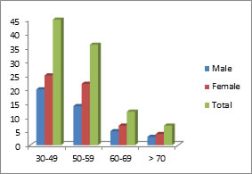 Respect to age consideration, 45 patients were in the age group of 30- 49 yrs, 36 patients in 50-59 yrs, 12 patients in 60-69 yrs and 7 patients in more than 70 years. Mean and S.D of age (male) is 48.1±10.23. Mean and S.D of age (female) is 49.63±11.2. Mean age of all patients is 49.15 comparing this age among male and female Z - 0.53, p>0.05.