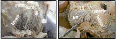 Variations in the branching pattern of facial nerve are not uncommon. We found that temporal branch was represented by five rami on both the sides. Gosain A K7, mentioned in his article that as per recent studies temporal branch is not a single branch but represented by more than one branches. We observed that on the right side there was a single zygomatic branch which was arising from the two rami and ran between lowermost ramus of temporal and upper buccal. This zygomatic nerve also showed communication with the upper buccal. The communication was H shaped. While on the left side zygomatic branch originated from a common stem with the upper buccal branch. In our study, we found two buccal branches upper buccal above the parotid duct while lower buccal below the parotid duct on both right and left sides. Liu AT8 in his study on facial nerve also found two buccal branches in 87.5% of cases. We found communication of upper buccal with the lower buccal. In addition to this on right side upper buccal was also communicating with the zygomatic branch while lower buccal was communicating with marginal mandibular branch while on left side there was common stem of upper buccal with zygomatic while of lower buccal with marginal mandibular. In addition to this on left side there was a loop of communication between the upper buccal and lower buccal around the parotid duct. Gosain A K7 said in his article that interconnections between the zygomatic and buccal branches were found in more than 70% of cases. In the study of such anastomotic patterns of facial nerve, Bandell H9 mentioned that earlier studies found communication between temporofacial and cervicofacial trunks in 60to 70 % of cases where as he found such communications in only 44% of cases. Lower rate of occurrences of such connections between the two trunks result in increased risk of facial palsy after transection of terminal branch. Temporal and zygomatic branches are more prone to injury in procedures like facial rhytidectomy, coronal or endoscopic bro lifting and temporal craniotomy.1 In our case, we found marginal mandibular nerve was represented by a single branch on both the sides. On the right side it was communicating with the lower buccal branch. This communication formed a loop with the upper buccal branch. Variations in the marginal mandibular branch is not uncommon. Karapinar U10 et al in his study on the course of nerve found that marginalmandibular nerve was represented by single branch in 36.4% of cases while he found two marginal mandibular nerve divisions in 63.6 % of cases. The author also found the communication of mandibular branch with the buccal branch in 4.6% of cases but had not described the type of communication. Woltmann M11 in his study also found communication of marginal mandibular branch not only with the buccal but also with the cervical branch.In surgeries of submandibular region, there are chances of injury to the marginal mandibular branch. Any injury to this nerve during the operation results in significant post–operative morbidity12. Saylam C13 mentioned in his article that marginal mandibular nerve is one of the most vulnerable branches to the surgical injury because of its location and surgeons operating specially for rhytidectomies should have a true knowledge of this branch.