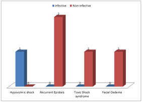 Table 4: Comparison of frequency of complications in both groups. Hypovalmic shock 1 (1.7%) in infective epistaxis patients. Recurrent epistaxis 2 (2.35%) in non-infective eptistaxis. Toxic shock syndrome 1 (1.7%) observed in non-infective epistaxis patients only. Facial oedema was observed 1 (1.7%) in non-infective epistaxis patients only. Table 4: Comparison of frequency of complications in both infective and non-infective epistaxis
