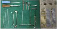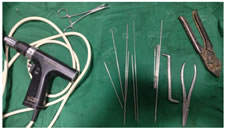 Figure 8: Instruments used in percutaneous k-wire fixation 1.5 -3 mm k-wire. Power Drill. Bone hook. K-wire bender. K-wire cutter. Plyer Procedure Patient in supine position with folded towel under to be operated shoulder. The humeral shaft and head segment are therefore aligned at the surgical neck by placing the arm into adduction and internal rotation. Apex anterior deformity is corrected with a posterior force and K-wires placed as for two-part surgical neck fractures. The arm is then placed into neutral rotation and abduction. A percutaneously placed bone hook is used to secure the greater tuberosity and to reduce it into the correct position. Fixation is achieved with two K-wires placed from the tuberosity and directed into the medial cortex of the proximal humerus. Access to the head is gained through the split between the greater and lesser tuberosities, almost invariably 5 mm behind the bicipital groove. Once coronal alignment of the head has been corrected, the head is fixed with two pins from the distal lateral humeral cortex into the humeral head. By reducing the humeral head, the greater tuberosity will usually regain its anatomic position, tethered by the bridging periosteum distally and the rotator cuff proximally. The greater tuberosity is then fixed either with K wires. These should be directed into the head proximally and into the shaft distally. The arm is then brought into 70 degrees of abduction and internal rotation to obtain an axillary view of the shoulder to visualize the profile of the anterior proximal humerus. The lesser tuberosity is then controlled with a bone hook and reduced under fluoroscopic guidance into its anatomic position. The arm is then mobilized under fluoroscopic visualization to confirm adequate stability. The lateral pins are cut to allow subcutaneous placement. Postoperative Care: NPO for 6 to 8 hrs. IVFs were continued as per patient. I. V antibiotics total 6 doses were given. analgesics as per patient complaints. arm pouch was used for immobilization of operated upper limb. same day of surgery post-op check x-ray was taken. at discharge patient was advised for immobilisation of operated arm for 4 weeks and arm pouch was given. tight fist and gentle movement of elbow was advised. rehabilitation programme was started after 4 weeks of surgery. as radiological sign of union was visible and clinically also it was evident k-wire were removed under local anaesthesia REHABILITATION PROGRAMME Pendulum exercises at operated shoulder were started after 4 weeks of surgery. Gentle range of motion exercises at the operated shoulder were started at the end of 4 weeks. 3 simple and easy exercises were told to the patients which he/she could at his/her residence without any supervision