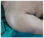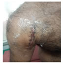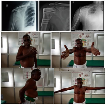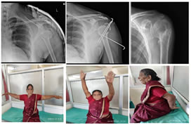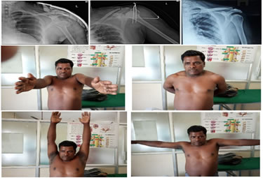 POST-OPERATIVE CARE NPO for 6 to 8 hrs. IVFs were continued as per patient. V antibiotics total 6 doses were given. analgesics as per patient complaints. arm pouch was used for immobilization of operated upper limb. same day of surgery post-op check x-ray was taken. dressing and wound inspection was done on the 2,5,7 post-op day. suture removal was done on POD 12 Figure 7: post-op day 12 for suture removal At discharge patient was advised for immobilisation of operated arm for 2 weeks and arm pouch was given. Tight fist and gentle movement of elbow was advised. Rehabilitation programme was started after 2 weeks of surgery. REHABILITATION PROGRAMME Pendulum exercises at operated shoulder were started after 2 wks of surgery. Gentle range of motion exercises at the operated shoulder were started at the end of 2 weeks. 3 simple and easy exercises were told to the patients which he/she could at his/her residence without any supervision