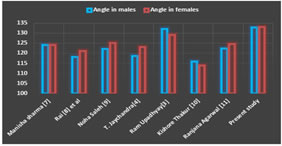 Graph 1: showing angle of mandible in different studies in male and female In our study, we did not find any significant difference in value of angle of mandible in male and female. This was in agreement with study by Ram Upadhyay[3] , Vinay Noha Saleh[9] Kishore Thakur10 , Ranjana Agarwal11, Raustia [12] and Ceylan13. When reviewed literature, Noha saleh23, Rai22, T Jaychandra[8], found greater angle of mandible in females than in males. Noha saleh9mentioned in the study of mandible in Egyptian population that ramus measurements were higher in females than in males while gonial angle is higher in females than males. The author justified the increase in angle in female saying it is due to downward and backward rotation of mandible in females compared with forward rotation in males. The mean gonial angle in this study was 1260. The author also mentioned different gonial angles in different human population groups - the average values were - 1190 in Indian, chinese and Peruvian, 1100 in Neanderthals, 1280 in Europian population 1240 in Jordanians. The author added that the large difference in the gonial angle in some of the population groups can be considered as racial identification while small difference in gonial angle in some might be due to homogeneity between different groups. Srineerija14 in her study mentioned that reason behind increase in thine gonial angle in male compared to females may be due to greater masticatory force in male than females. The author added that structure of gonial region is maintained by muscles like medial pterygoid and masseter and these muscles preserves the bone at the point of their insertion. Author Maneesha sharma7 in her study found average mean angle of mandible in females (124.03 ± 5.3) is higher than in males (124.13 ± 5.18). Author considered this difference as insignificant as on statistical analysis P value was not higher than 0.05
