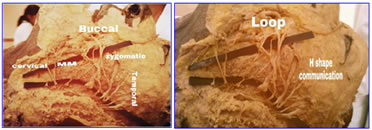 DISCUSSION The variations in the terminal branches of facial nerve is not uncommon. In our case, we found variations in the number of branches of temporofacial and cervicofacial trunk and intercommunications between the different branches. We found that temporal branch was represented by total four rami. Gosain A K3, mentioned in his article that as per recent studies temporal branch is not a single branch but represented by more than one branches.We also found communicating branch between zygomatic and adjascent temporal branch giving H shape to the communication.We found total three ramifications of zygomatic branch. Out of these two branches had the same course and supplied same group of muscles while one branch deviated from the course and joined the upper buccal branch for a short distance and then got separated and formed a loop with the upper buccal branch. A communicating branch is also found between the zygomatic and buccal branch at the level of emergence from the anterior border giving H-shape to the communication and two branches. The communication between zygomatic and buccal branch is the communication between cervicofacial and temporofacial trunk. Author Gosain A K3 in his study found such interconnections between the branches of two trunks in more than 70% of cases while Bandell H4 found in 44% of cases. In case of cervicofacial trunk, we found a single buccal branch which further divided into upper and lower buccal branch. There was a loop of coomunication between the upper and lower buccal branches which is joined by twig from the marginal mandibular branch. Sometimes rather than one buccal branch dividing into upper and lower buccal we get two buccal branches separately. Liu AT5 in his study on facial nerve found two buccal branches in 87.5% of cases. We found two ramifications of marginal mandibular nerve both of which joined lower buccal branch and formed a loop. Author Karapinar U6 et al. in his study found such two ramifications of marginal mandibular nerve in 63.6% of cases. The author in his article also mentioned communication between marginal mandibular and buccal branches in 4.6% of cases but had not mentioned the structure or type of communication. In case of cervical banch, we found immediately after arising from the trunk, the cervical branch divided into two branches out of which the upper branch again ramified into two rami. One of the ramus from the upper cervical branch formed a loop with marginal mandibular branch. Our this finding of communication between marginal mandibular branch not only with buccal but also with the cervical branch is similar to the findings by author Woltmann M7. The interconnections between the different branches of temporofacial and cervicofacial trunk or within the branches of same trunk are important. There is increased risk of facial paralysis in case the terminal branch is transected if the interconnections between the branches of facial nerve are less1. In procedures like facial rhytidectomy, coronal or endoscopic bro lifting and temporal craniotomy there is more probability of injury to temporal and zygomatic branch while in surgeries of submandibular region there are chances of injury to marginal mandibular branch8. Saylam C9 in his article mentioned that marginal mandibular branch is more prone to injury in procedure of rhytidectomies and surgeons must be aware of probable variations in location and branching pattern of marginal mandibular branch.When compared, our case can be included in sixth category of Devis classification where multiple anastomosis are found between temporofacial and cervicofacial divisions and marginal mandibular branch send twigs to temporofacial branch. In case of Kwak’s classification, it can be included into category four where communication is present between nerve twigs from the zygomatic and marginal mandibular branches with buccal branches. A unique anomalous ganglion of pin head size was found near the loop formed by zygomatic, buccal and marginal mandibular branch. So many rami were seen emerging from this ganglion. One of the ramus supplied a communicating branch to the adjascent loop. Among the different extensions of parotid gland the anterior extensions are two - one is ‘Facial process’ which is attached directly to the gland and another is ‘accessory parotid gland’ which is completely separated from the main gland like a detached glandular mass10. An accessory parotid gland is the salivary tissue present in close association or anterior to the Stensen's duct, lying on the masseter muscle but away from the main parotid gland11,12. It is found in 21-61% of cases as per different autopsy studies11,13. In our case, we found an accessory parotid gland which was located anterior to parotid duct or stensen’s duct and was approximately 1X2 cm in size without any secondary duct.