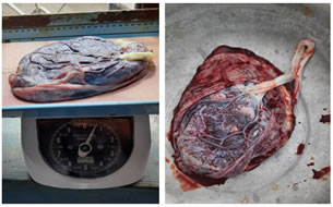 DISCUSSION The weight of the placenta is used in the determination of the foeto-placental ratio. The weight of the placenta gives an idea of the amount of substance that is exchanged between the mother and the foetus. The mean placenta weight was 458.25g+\-99.71 (SD ) with a range of 289 to 754 in fetal weight >2.5kg and540.09+\-83.69(SD) with range of377 to 815 in fetal weight >2.5kg(Table.1and2). The weight of the placenta was found to have a significant positive correlation with the weight of the baby (r = 0.464, p<0.01)(Table.3). Luz (2001), in a similar experiment found the mean placental weight to be 537g (SD=96g). Lurie et al., (1999) also found the mean placental weight to be 613.0±123.8g with a range of 319- 1266g whilst Lo et al., (2002) had the mean placental weight to be 646.2±0.3g. However, (Borton, 2006) put the weight of the term placenta between 400- 600g, whilst (Yetter, 1998) put the term placenta to be about 470g. Comparing the mean placental weight obtained in this experiment to those obtained above, it was realised that the mean placental weight obtained by Yetter, (1998) was too low to be taken as the mean while that of Luz was more to the mean obtained in the present study. In contrast, Lurie et al. (1999) mean placental weight was found to be higher than the one obtained here. Since Borton gave a range for the term placental weight, the mean placental weight obtained fell within this range even though the range here was 289-815gm. This indicates that the mean placenta weight differs from place to place and may be due to so many factors such as nutrition, genetics, gestational age, maternal size, etc It was found that the placental weight correlates significantly with the weight of the baby and for every 1g increase in the placental weight, the foetal weight increases by 2g and this corresponds to (Luz, 2001) who found that for every 1g increase in placental weight, the foetal weight increases by 1.98g. Since the weight of the placenta correlated positively with the fetal weight , it then implies that, factors which directly affect the weight of the baby will indirectly affect the weight of the placenta. Such factors could include nutrition, maternal size, maternal haemoglobin gain, altitude, paternal factors, maternal and paternal genetics, gestational age, maternal diabetes mellitus, etc. According to (Van den Broek et al., 2005), unfixed placentae that weigh more than 600g are pathologic, but more important may be the placenta/foetal ratio. Chronic low uteroplacental blood flow is the most frequent cause of small placentae, but often the foetal weight is affected, so the ratio may be normal. The cause of enlargement may be unknown, but it is often revealed if the following are considered: overt or latent maternal diabetes, maternal anaemia, maternal–foetal blood group incompatibility, maternal–foetal transfusion, chronic intrauterine infection (syphilis), foetal malformations (especially of the lung), the twin transfusion syndrome, congenital neoplasms (e.g., neuroblastoma, teratoma, and chorangiomas) and alpha- thalassaemia. Some of these factors may be responsible for the differences between the placental weight obtained in the present study and those obtained by Salafia and Vintziloes (1999).