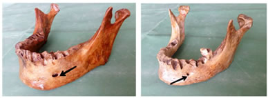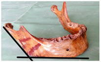 Materials and Methods 100 dried adult human mandibles with complete dentition and intact alveolar margin of unknown sex obtained from the Department of Anatomy, Meenakshi Medical College Hospital and Research Centre, were used for this study. The shape (oval and round), size, location, number of MF, the direction of opening of mental foramen were measured on both sides of the mandible by using Vernier caliper. The shape of MF observed was either oval or rounded. Mean horizontal and vertical diameters were measured. Location of MF was identified by using the following parameters: (i) Distance from mental foramen to mental symphysis; (ii) Distance from mental foramen to alveolar margin and (iii) Distance from mental foramen to the inferior border of the mandible (iv) Distance from the posterior border of the ramus of mandible to the mental foramen. The position of MF was noted about mandibular teeth. The direction of opening of MF was recorded as posterosuperior, superior, lateral, anterosuperior, posterior or anterior [9]. The location of mental foramen about anatomical landmarks was recorded :(i) in line with the second premolar (ii) Between the first molar and second premolar (iii) in between the first and second premolar (iv) in line with the first molar (v) in line with the first premolar. The angle of the mandible was measured with the help of a protractor. The angle of the mandible was taken as the angle between the base and a tangent drawn along the posterior border of the ramus, touching the posterior-most point on the condyle and the posterior-most point on the posterior border. A comparison of the mean values between sides was performed using the t-test, p-value<0.05 was considered statistically significant.
