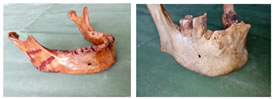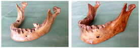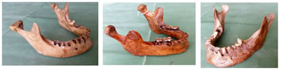 Figure 8 Figure 9 Figure 10 Figure 11 Figure 12 Figure 8: Showing the MF in the line with the second premolar; Figure 9: Showing the MF between second premolar and first molar; Figure 10: Showing the MF between the first and second premolar; Figure 11: Showing MF in line with first molar; Figure 12: Showing MF in line with first premolar The direction of exit of the MF was posterosuperior in 50.7%, followed by superior in 34.07%, Posterior in 8.2% and Laterally in 7.03% of the mandibles.( fig 13 ,14,15,16). Figure 13 Figure 14 Figure 15 Figure 16 Figure 13: Showing posterosuperior exit of MF; Figure 14: Showing Superior exit of MF; Figure 15: Showing posterior exit of MF; Figure 16: Showing Lateral Exit of MF Table 3: Comparison of shapes of mental foramen