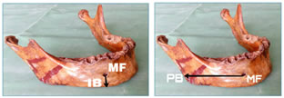 Figure 4 Figure 5 Figure 6 Figure 7 Figure 4: Showing Distance between MF; Figure 5: Showing Distance and Symphysis Menti between MF and alveolar margin; Figure 6: Showing Distance between MF and lower border of Mandible of Ramus of Mandible; Figure 7: Showing Distance between MF and posterior border of Ramus of Mandible The position of mental foramen about mandibular teeth on the two sides is shown in Table II. The most frequent position of a foramen about the teeth was in line with the longitudinal axis of the 2nd premolar for both right (86.1%) and left (84.75%) sides. The second common position was between first and second premolar (right 5.2%; left 5.85%), followed by inline with the first premolar between (right 4.4 %; left 5.35 %) and between the second premolar and first molar ( Right 3.2% and Left 2.65%); the least common position was in line with the first Molar (right 1.1 %; left 1.4 %)