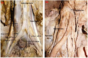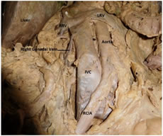 In all the cadavers the formative tributaries were right and left common iliac veins. Variation or anomaly of any type was not observed. In the present study the right renal vein opened into the IVC at the level of L1 vertebrae in 30% of cases and at L2 vertebrae in other 30% of cases, while on the left side 40% of renal veins drained at the level of L1 vertebrae. The lowest level of drainage of renal veins was observed for the right renal vein at the level of L3-L4. While the highest level of drainage was observed at T12 level, on right and left side in two and one cadaver respectively. The incidence of right hepatic veins draining separately into IVC in the reported literature has varied from 83% to 90%. The incidence of common ostia draining left and middle hepatic vein in various literatures has varied from 70% to 88%. Incidence of paired lumbar veins was 52% while that of unpaired was 48% in the present study. In one study the incidence of unpaired lumbar veins was 62%, while in the present study the incidence of paired and unpaired lumbar veins is almost equal. The knowledge of lumbar veins and their variations is important while carrying out surgeries on the lumbar vertebra through anterior approach.