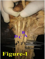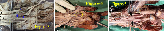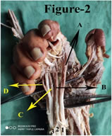 RESULTS Out of 150 upper limbs of 75 formalin embalmed human cadavers the following congenital variations of lumbricals were noted- In seven middle aged male cadavers all right-handed lumbrical muscles were arising from the tendons of FDP, proximal to the flexor retinaculum in the lower anterior part of the forearm and extending in to then palm through carpal tunnel. Fourth lumbrical was noted as unipennate, arising from the radial side of FDP tendon of little finger. (Figure-1) In one middle-aged female cadaver all right-handed lumbrical muscles were arising from the tendons of FDP, proximal to the flexor retinaculum in the lower anterior part of the forearm and extending in to then palm through carpal tunnel. All lumbricals were noted as unipennate, with congenital absence of FDP tendon of little finger. Third and fourth lumbricals are arising from the respective sides of FDP tendon of ring finger. (Figure-2) In left upper extremity of one male cadaver bulky (hypertrophied) second and third lumbricals were noted in the carpal tunnel, and fourth lumbrical origin was noted in the lower anterior part of forearm proximal to the flexor retinaculum. Second lumbrical was noted as bipinnate arising from the palmar side of FDP tendon of middle finger and radial side of FDP tendon of ring finger. Third lumbrical was noted as unipennate arising from the radial side of FDP tendon of ring finger. (Figure-3) In left upper extremity of one female cadaver bulky (hypertrophied) second, third and fourth lumbricals were arising in the carpal tunnel from the tendons of FDP. First lumbrical was bipinnate arising from the radial side of FDS and FDP tendons of index finger. (Figure-4 and Figure-5) Figure 1 Figure 2 Figure 1: Showing higher origin (in the lower part of forearm) of anomalous lumbricals in a right hand( A, B, C, D- First, second, third (bipinnate) and fourth (unipennate) lumbricals; 1, 2, 3, 4- medial four tendons of FDP); Figure 2: Showing higher origin (in the lower part of forearm) of anomalous lumbricals in a right hand with congenital absence of FDP tendon to the little finger (A, B, C, D- First, second, third (unipennate) and fourth (unipennate) lumbricals; 1, 2, 3 - tendons of FDP); Figure 3: Showing higher origin (in the lower part of forearm) of anomalous lumbricals in a left hand with congenital absence of FDP tendon of little finger (A, B, C, D- First, second (bulky bipinnate), third (bulky bipinnate) and fourth (bulky bipinnate) lumbricals; 1, 2, 3 - tendons of FDP); Figure 4: Showing anomalous lumbricals in a left hand (Yellow circle-- First lumbrical(bipinnate); 1- tendon of FDS; 2 - tendon of FDP); Figure 5: Showing higher origin of anomalous lumbricals in a left hand with anomalous muscle (Black circle- Anomalous muscle in the lower part of forearm; Black arrows- Bulky second, third and fourth lumbricals)