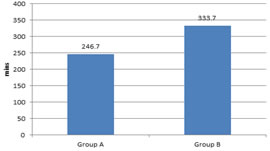 Figure 6: Onset of motor blockade The mean time of onset of motor blockade group A was 228.7 ± 20.5 seconds and the meantime of the onset of the motor blockade in Group B was 229.5 seconds. In this study out of 60 patients the meantime for two-segment regression in group A was 83.0 Minutes and in group B was 114.5 minutes. Figure 7: Time for two segment regression of sensory level In this study out of 60 patients, the time for full motor recovery in group A was 192.7 minutes and in group B was 206.6 minutes.