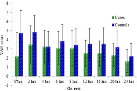 stastically analysed with continuous measurements and are presented on Mean ± SD (Min-Max) VAS is more in control group (p<0.001at 0 hours,p=0.001at 2hrs,p0.46 at 6hrs,at 12 and 16hours0.002) VAS=visual analogue score