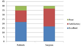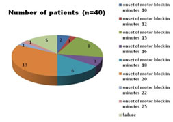 The mean performance time for procedure in our study was 14.60±2.74 minutes. Maximum time to perform the block was 20 minutes in one case and minimum time to perform the block was 10 minutes in 2 cases. The mean onset time for sensory block was 11.09±2.47 minutes and mean onset time for motor block was 17.69±3.40 minutes (Figures 1 and 2). The mean duration of Motor block was 196.95±40.15 minutes. Mean duration of Sensory block was 279.63±102.90 minutes (Figures 3and 4). Quality of block was graded by patient and surgeon (Figure 5). Figure 1 Figure 2