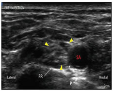 Figure 3 Figure 4 Figure 1: A Pie Chart showing frequency distribution for time of onset of sensory block; Figure 2: A Pie Chart showing frequency distribution for time of onset of motor block; Figure 3: A Pie Chart showing frequency distribution for time of total duration of Motor block; Figure 4: Pie chart showing frequency distribution for time of total duration of Sensory block Figure 5: A Bar Diagram showing proportion for patient and surgeon satisfaction Figure 6 Figure 7 Figure 6: View on the USG screen before injection of local anesthetic drug; Figure 7: Postanesthetic injection: Right supraclavicular brachial plexus (yellow arrows) Brachial plexus = yellow arrows. FR = first rib, SA = subclavian artery, P = pleura, * = corner pocket. Local anesthetic (dashed lines) had been deposited in corner pocket (*). Note the nerves now appeared to be floating on the injected anesthetic drug. FR = first rib, SA = subclavian artery.