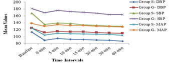 The mean baseline haemodynamic parameters of all mothers were high, although in the acceptable range for preeclampsia and found no statistically significant differences (p>0.05) while the mean haemodynamic parameters of mothers in group G was higher than group S throughout the intraoperative period. Changes in maternal haemodynamic in patients studied under group S and group G shows statistically significant difference (p<0.05), (Figure 1).