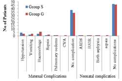 The difference in maternal (p=0.7) and neonatal complications (p=0.9) was not significant as depicted in figure 2. Total ICU admissions in group G were 13 (26%) patients and in group S 3 (6%) patients and difference was statistically significant (p=0.003). There was no death in group S and only 1 death in group G. No neonatal mortality was noted among both the groups. Figure 2: Comparison of maternal and neonatal complications