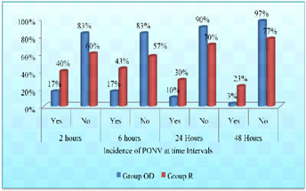 Graph 1: Incidence of PONV among OD and R group at regular intervals