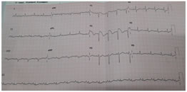 Figure 1: Electrocardiographic Recordings of patient Anaesthesia was conducted after supplementing anti aspiration prophylaxis with Ranitidine. General anaesthesia supplemented using Intravenous Midazolam 1.5mg, Fentanyl 100µg, Propofol 120mg and 20mg in two aliquots, supraglottic airway device (proseal LMA) with spontaneous ventilation achieving MAC 1.3 (O2 in N2O with sevoflurane). Injection Paracetamol 1 gm was supplemented as analgesia and Injection Dexamethasone 4 mg for Postoperative nausea and vomiting and as antiaspiration coverage. Duration of the procedure was 25 minutes, intraoperative period was uneventful and towards the end of the surgery patient was extubated. CASE SERIES III 47 year aged male diagnosed as Brugada syndrome with no clinical cardiac symptomatology presented with abdominal pain, nausea and fever for about 2 days. Clinical suspicion was duodenal perforation and planned for laparotomy for perforation patch closure. Biochemical and renal parameters were within normal limits except ECG changes. Risk consent obtained explaining the consequences of general anaesthesia, need for ICD and invasive arterial lines. Anaesthesia was induced with intravenous Midazolam 1.5mg, Fentanyl 100µg, Propofol 120mg after securing right radial arterial line for monitoring blood pressure; intubated with 4MAC blade using 8.5cETT and Atracurium 30mg and maintained with O2 in air, sevoflurane achieving a MAC of 1 to 1.2. Intraoperative period was uneventful; required one incremental dose of Atracurium and the duration of surgery was about 100 minutes. Paracetamol 1gm was supplemented as an analgesic and at the end of the surgery, Lidocaine 40mg IV supplemented to alleviate the stress response. Patient had spontaneous return of respiratory efforts and good muscle tone favouring extubation without use of reversal of neuromuscular blocking agent. Post extubation patient was stable haemodynamically and monitored in HDU.