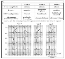 Figure 2: Pathophysiology depiction of Brugada syndrome5 The pathophysiology of Brugada syndrome appear that the sodium channels of the right ventricular epicardium are affected and not the endocardium. This alteration of action potential in the epicardium causes differential repolarization and refractoriness across the myocardium leading to a vulnerable period during which a premature impulse or extra systole can trigger a recent dysrrythmias4. Certain physiological and external factors can unmask or exacerbate the channel dysfunction. These include febrile episodes, autonomic imbalances, electrolyte disturbances; drugs that affect the sodium channels particularly class Ia and Ic, antidysrhythmics, tricyclic antidepressants, lithium, Benadryl and cocaine2. The predominant risk factors for the arrythmogenic potential in Brugada includes spontaneous type I ECG pattern, prolonged QRS, T wave alternans, early repolarization pattern in inferolateral leads, male sex, syncopal episodes, nocturnal agonal respiration, previous episodes of ventricular tachycardia or ventricular fibrillation6. Figure 3: Various ECG Types of Brugada Autonomic changes and multiple pharmacological interactions commonly seen during anesthesia may exacerbate the underlying disease process and trigger Brugada ECG changes and malignant arrhythmias. Beta blockers, alpha agonists, vagotonic agents have been shown to exacerbate the ECG changes7, typical of brugada, as having pressure on carotid body, perioperative hypothermia, light anesthesia and post operative pain. Local anaesthetic especially bupivacaine given by any route cause a sudden rise in the serum concentration, can unmask brugada syndrome. Class IIb antiarrhythmic drug Lignocaine has no such effect and can be safely used7. Syncope is the commonest presenting symptom and idiopathic in majority of cases. Hence this order is of specific concern to anaesthesiologist as they routinely administer drugs that interact cardiac ion channels which theoretically could trigger the development of malignant hypothermia. There are few report of regional technique used as the primary anaesthetic technique8. Two of the three reported cases involving epidural anesthesia reported problems, where Bupivacaine was used in both the cases and there was no preoperative diagnosis of Brugada syndrome. The changes completely resolved on discontinuation of epidural bupivacaine infusion. An asymptomatic patient with an unrecognized preoperative brugada ECG underwent general anesthesia combined with a thoracic paravertebral block using 40ml 0.5% Ropivacaine9. The patient developed intra operative bradycardia, hypotension and unstable ventricular tachycardia requiring inotropic support shortly after surgery was commenced. An epidural bupivacaine infusion had been administered to a known young brugada patient with palpitations but reported without any anticipating incident10. One report of spinal anesthesia using 10mg of 0.5% bupivacaine for repair of patella fracture which was uneventful intraoperatively11. From the cases described, there is conflicting evidence regarding the anesthesia techniques12 and regional anesthesia is safer; but care should be taken to monitor the unmasking effect of arrhythmias under regional anaesthesia. Autonomic nervous system to neuraxial anaesthesia effects also plays a pivotal role apart from local anaesthetic systemic action in brugada individuals13. In our case, we decided on epidural anesthesia for first patient and the local anaesthetic used was lignocaine with adrenaline which was administered in graded doses to achieve a blockade at L1 level. Continuous monitoring of ECG, NIBP and SpO2 was done. Patient was haemodynamically stable throughout the procedure. Epidural catheter was removed at the end of the procedure. Post operative management was taken care with intravenous paracetamol and tramadol. Literature reveals complications with Bupivacaine14 and Prilocaine15 during neuraxial anaesthesia suggesting the unmasking effect of arrhythmias. We were deliberate to give general anaesthesia for our second case inview of abscess involving near the neck and preferably focusing on airway maintainence also considering the risk stratification of the coexisting syndrome. Knowing that the general anaesthesia can aggravate the autonomic nervous system and can produce various tachyarrhythmias, meticulous care taken at the time of conduct of anaesthesia keeping all backup ready. Flamee et al.16 in his randomized study with the action of Propofol on electrocardiographic pattern of any degree confirmed that there was no signals in detection of malignant arrhythmias triggered by Propofol and its use as induction agent of anaesthesia in Brugada individuals was considered safe. The mechanism postulated17 was that it could be due to the inhibition effect of the transient potassium current in the right ventricle outflow epicardial cells and repolarization related arrhythmic abnormalities. A single dose of propofol usually exhibits adjustment and rebalancing in the ionic channel currents18. In our last case, we used general anaesthesia with controlled ventilation in view of upper abdominal surgery for safe conduct of anaesthesia and surgery. Emergency cardiac drugs, ICD and all resuscitation drugs were kept ready prior to conduct of anaesthesia. There was no hypoxia, hypercarbia, hypothermia, acidosis or alkalosis intraoperatively. Crystalloids were used for intravascular volume replacement and detailed pharmacological interventions were planned. Smooth conduct of anaesthesia conducted with cardiologist backup for emergency intervention in view of known Brugada syndrome. Implantable cardiac defibrillator is the only established effective therapy in the management of Brugada syndrome and the use of pacemaker, ablation or cryosurgery is still controversial. Beta adrenergic agonists (isoproterenol), Quinidine, phosphodiesterase inhibitors (Cilastazol) and cardio selective blockers 
