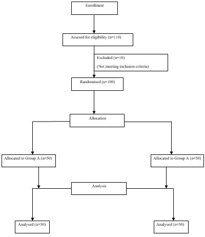 MATERIALS AND METHODS This prospective randomized double blind study was carried out in 100 ASA grade I and II patients of either sex, aged 18-60 years posted for elective femoral bone surgeries under spinal anaesthesia (SA) [Figure 1]. This parallel designed (allocation ratio 1:1) study was conducted in a tertiary care unit from January 2019 to July 2019 after obtaining hospital ethical committee approval (BV(DU)MCandH/Sangli/IEC/360/19) and informed written consent from the patients for study and publications. Patients having any cardiorespiratory, neurological or psychiatric illness, coagulation abnormalities, known sensitivity to local anaesthetics were excluded from the study. Randomization was done by a sealed envelope method. The patients and the anesthesiologist monitoring the patients were blinded to the procedure. Patients admitted for surgery following an overnight fast of 8-10 hours. At the preanaesthetic interview the patients were familiarized with a VAS scale and other postoperative questionnaire . Patients were premedicated with Ondonsetron 4mg i.v. . On arrival in the operating room, routine monitoring devices were placed, and baseline blood pressure, heart rate and pulse oximetry values were recorded. All study patients were given Injection dexamethasone 8mg IV as a part of multimodal analgesia. After surgery, the patients in group A were given FICB with 40 ml of 0.25% levobupivacaine under US guidance. The high frequency linear probe (13-6 MHz, Sonosite turbo) was placed just below the inguinal ligament in longitudinal plane. After visualization of femoral vessels the probe was moved laterally to visualize the fascia lata, fascia iliaca and psoas muscle. A 23 G spinal needle connected to 10 cm extension tube was passed from lateral to medial side parallel to the probe in longitudinal axis. A plane is created between fascia iliaca and iliopsoas muscle with two ml of normal saline. Then 40 ml of 0.25% levobupivacaine was injected into the plane and spread of drug was observed towards femoral nerve. This time was considered as zero time for assessment of parameters. In group B, only painting and draping of inguinal area was done, but block was not given. Postoperative pain scores were assessed by using a visual analogue scale score at 15 minutes, 2 hours, 6 hours 12 hours and 24 hours postoperatively. At the same time the side effects like nausea, vomiting and complications like haematoma if any were also noted. Duration of analgesia was considered as the time taken between zero time and the first analgesic demand by the patient. Injection tramadol 1mg/kg IV was given as a rescue analgesic at VAS ≥ 4 with a maximum dose 400 mg in 24 hours. Number of rescue analgesics required and total analgesic consumption in 24 hours were also recorded. The patients who required rescue analgesic in the immediate postoperative period were excluded from the study. The confounding variables like use of adjuvants which may interfere in results were eliminated. Patients with history of drug use/abuse, psychiatric disorders or chronic pain were also excluded. The sample size was calculated with the help of the reference of previous study.8 With a 5% α level of significance and 90% power of the test to detect a difference of 4.6 hours between the two groups, minimum sample size calculated by using a statistical formula was 50 per group.9,10 Data was collected and tabulated in excel sheet. Data was compared and analyzed statistically for the significance of observed differences if any. The P values < 0.05 were considered significant and P<0.01 was considered highly significant. The results were expressed as Mean ± SD (Standard Deviation) for continuous variables. Mean was obtained for VAS scores .Unpaired t-test was used for inter-group comparison of continuous variables. Numerical data were compared within the group against baseline values using paired t-test. Mann -Whitney U test was used to compare ordinal variables. Statistical package for social sciences (SPSS) version 22 for windows (IBM – Chicago) was used for statistical analysis and to draw conclusions.