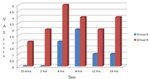 RESULTS Demographic data of two groups were comparable and nonsignificant.[Table 1] The one hundred and ten patients were enrolled for the study, out of which hundred patients were analyzed [Fig. 1]. The time for first analgesic request was significantly prolonged in FICB group (Group A = 8.16±0.45 h vs Group B = 2.67±0.34 h).[Table-1] VAS pain scores within first 24 hours were observed to be on the lower side in FICB group. [Fig-1] [Table-2] The total 24 hours analgesic consumption was found to be reduced in FICB group (Group A = 214.29±45 = mg vs Group B = 390.53±48 mg).[Fig-2] Postoperative agitation was more in Group B (n=0 vs n=4)