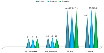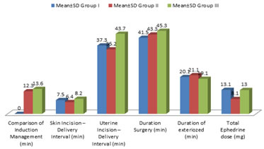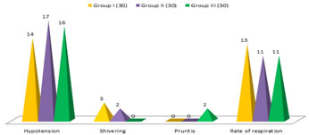 Table 2: Classification of patients as per their Emetic Episodes No Nausea 8 (8.8%) in group-I, 18 (20%) in group-II, 23 (25.5%) in group-III, Nausea– 10 (11.1%) in group-I, 7 (7.7%0 in group-II, 4 (4.4%) in group-III Retching – 7 (7.7%) in group-I, 3 (3.3%) in group-II, 2 (2.2%) in group-III Vomiting – 5 (5.5%0 in group-I, 2 (2.2%0 in group-II, 1 (1.1%) in group-III Table 3: Comparison of adverse intro-operative events Hypotension – 14 (15.5%0 in group-I, 17 (18.8%) in group-II, 16 (17.7%) in group-III Shivering – 3 (3.3%) in group-I, 2 (2.2%) in group-II, 0% in group-III Pruritis – 0% in group-I and II, 2 (2.2%) in group-III Rate of respiration – 13 in group-I, 11 in group-II, 11 in group-III Table 4: Apgar score (a) 9 (8-10) in group-I, 9 (6-10) in group-II, 9 (7-10) in group-III in 1 minute (b) 10 (9-10) in group-I, 10 (7-10) in group-II, 10 (8-10) in group-III in 5 minutes NACS scores – 15 minutes – 37.2±1.11 in group-I, 37.3±1.2 in group-II, 37.4±1.3 in group 4 – In – 2 hours – 38.2±1.1 in group-I, 37.5±1.3 in group-II, 37.3±2.0 in group-III
