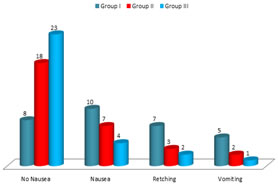 Statistical analysis: To compare the incidence of emetic symptoms of three groups ANOVA test was applied, Episodes of emetic symptoms of emetics, in evidences of adverse intra-operatic events were classified with percentage. The statistical analysis was carried out in SPSS software