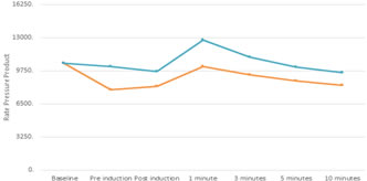 Baseline: There was no statistically significant difference between the two groups (p value = 0.92). Pre induction: There was no statistically significant difference between the two groups (p value =0.08). Post induction: There was statistically significant difference between the two groups (p value =0.002). After Intubation: There was rise in mean rate pressure product in Pregabalin group. At 1 minute, there was significant difference between mean rate pressure product of two groups (p value <0.001). In Pregabalin group 21% rise from the baseline compared to 2.8% fall from baseline in clonidine group. At 3 minutes, there was significant difference between mean rate pressure product of two groups (p value = 0.005). At 5 minutes, there was significant difference between mean rate pressure product of two groups (p value = 0.009). At 10 minutes, there was significant difference between mean rate pressure product of two groups (p value = 0.014). Electrocardiogram: No ST-T changes were observed in ECG of any the patients throughout the study period. No arrhythmias were noted in any of the patients throughout the study period. SpO2: Spo2 was maintained 98% and above in all the patients.