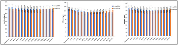 Figure 1 Figure 2 Figure 3 Figure 1: Intraoperative heart rate between the study groups (beats per minute); Figure 2: Intra operative Systolic blood pressure (mm Hg); Figure 3: Intraoperative diastolic blood pressure (mm Hg) Table 3 shows the distribution of various elective ambulatory surgeries which included gynecological, urological, orthopedics and general surgeries Table 1: Distribution of ambulatory surgeries between the groups (percentage)