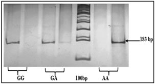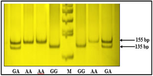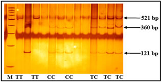 Figure 1: ARMS PCR showing genotypes of TNF-α -308G/A Figure 2: Genotypes of TNF-α -1031T/C polymorphism based on PCR-RFLP Polymorphism TT: 521 bp, TC: 521+360+121 bp, CC: 360+121 bp, Marker (M) = 100bp    Figure 3: Depicting genotypes of TNF-α -238G/Apolymorphism GG: 135+20 bp, GA: 155+135+20 bp, AA: 155 bp, Marker (M) = 100bp