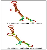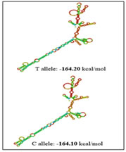 Figure 4 Figure 5 Figure 6 Figure 4: Secondary pre-mRNA structures of the TNF-α –238G/A polymorphism; Figure 5: Secondary pre-mRNA structures of the TNF-α -308G/A polymorphism; Figure 6: Secondary pre-mRNA structures of the TNF-α -1031T/C polymorphism    Figure 7: Linkage disequilibrium plot of the variations in PCOS and controls in the present study (D’ values were indicated in the respective squares)    Figure 8: Dendogram showing the interaction between various genes involved in the study DISCUSSION PCOS represents a common endocrine disorder seen in women of reproductive age and is often associated with inflammation6. The persistent chronic inflammation observed in PCOS could lead to ovarian dysfunction and other metabolic abnormalities7. TNF α is a proinflammatory cytokine present in follicular fluid of human ovary, granulosa cells and oocytes8, plays an important role in a wide range of diseases such as type 2 diabetes, coronary artery disease and dyslipidemia9. It elicits inflammatory responses as a normal physiological function for ovulation and influence follicular atresia, adiposity, insulin resistance, ovarian apoptosis, increased ovarian steroid secretion, anovulation and hyperandrogenism10. The present study was investigated to identify the association between three promoter polymorphisms (-238G/A, -308G/A and -1031T/C) and PCOS, a condition associated with inflammation. The genotypic and allele frequencies of -238G/A did not differ significantly between the patients and the controls indicating no role of this SNP in PCOS susceptibility. The minor allele ‘A’ of the −238G/A polymorphism and the rare allele ‘C’ of the −1031T/C polymorphism were reported to be associated with higher TNF- production11.The TNF-α -238G/A promoter polymorphism leads to addition of transcription factors T3R and Sp1 which play an important role in controlling cell growth and apoptosis The distribution of genotypes and did not vary between the groups; suggesting no association of -308G/A polymorphism with PCOS. Our results were in accordance with the studies in Australian, Caucasian and Indian population12. The rare ‘A’ allele of −308G/A polymorphism reportedly influences gene expression, resulting in higher TNF-α production in vitro13. The TNF-α -308G/A promoter polymorphism leads to deletion of binding sites of two transcription factors Sp1 and Usf (Upstream Stimulatory Factor) which may result in dysregulation of transcription and translation hence regulatory in nature. Our study also demonstrated no association of TNF-α -1031 T/C with PCOS and these findings suggested a strong influence on PCOS, similar to the findings of others in Asian population8,14 however contradictory to our study. The TNF-α -1031T/C promoter polymorphism leads to addition of GCN4 transcription factor containing leucine zipper or zinc finger motifs. It contributes to the ribonuclease activities controlling gene expression and RNA biogenesis in the nucleus, the major site of RNA turnover. A potential physiological role of TNF-α -308 G/A polymorphism has been identified in several studies15,16 and much recent reporter gene studies demonstrated a significant effect on its transcriptional activity (8, 17). Variation in TNF-α gene was reported to be linked with PCOS susceptibility in Korean population. Studies on TNF-α gene in PCOS patients from Australian, Caucasian and Indian population revealed lack of association of TNF-α -308 G/A polymorphism8,18,19. Li S et al. proposed that elevated TNF-α have been linked to obesity and insulin resistance in the Chinese population20. Literature suggest PCOS is a complex disorder that might result from the interaction of susceptible and protective gene variants under the influence of environmental factors 21 suggesting that the clinical phenotype of affected individuals is also influenced by gene-environment interaction.