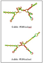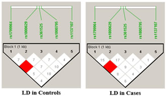 RESULTS The present study was aimed to identify the association between PCOS and three promoter single nucleotide polymorphisms of the TNF-α gene viz -238G/A (rs361525), -308G/A (rs1800629) and -1031T/C (rs1799964) The percentage of GG, GA and AA genotypes in patients was 24, 44, 32 while it was 25, 45 and 30 in controls respectively. The allele frequencies of G and A allele are 0.46 and 0.54 for patients while it was 0.48 and 0.52 for controls correspondingly. The genotype and allele frequencies did not differ significantly between the groups. The patients as well as the controls were following Hardy Weinberg Equilibrium. The genotype and the allele frequencies of the patients and controls are given in Table 7.1. Risk analysis in order to identify the role of the individual genotype, did not reveal any protective or predisposing role towards PCOS. Mendelian effect modelling also did not yield any significant outcome. The risk estimates of TNF--238G/A genotypes and alleles among the study group are given in Table 7.2.Secondary structure analysis of the pre-mRNA revealed distinct changes with the entropy being high in the variant allele (-48.80 kcal/mol) compared to wild type allele (-49.80 kcal/mol) (Figure 5). The percentage of GG, GA and AA genotypes in patients was 25, 50 and 25 while it was 23, 47 and 30 in controls respectively. The allele frequencies of G and A allele are 0.5 and 0.5 for patients whereas it was 0.47 and 0.53 for controls correspondingly. The genotype and allele frequencies did not vary between the groups. The patients as well as the controls were following Hardy Weinberg Equilibrium. The genotype and the allele frequencies of the patients and controls is given in Table 3. Risk analysis in order to identify the role of the individual genotype, did not reveal any protective or predisposing role towards PCOS. Mendelian effect modeling also did not yield any significant outcome. The risk estimates of TNF--308G/A genotypes and alleles among the study group are given in Table4 Secondary pre-mRNA structures built were showing distinct energy changes for the respective alleles of SNP with the entropy being high for the variant allele (-95.10 kcal/mol) compared to wild type allele (-95.60 kcal/mol) Figure 6. The percentage of TT, TC and CC genotypes in patients was 24, 38, 38 while it was 25, 40 and 35 in controls respectively. The allele frequencies of T and A allele are 0.43 and 0.57 for patients while it was 0.45 and 0.55 for controls correspondingly. The genotype and allele frequencies did not differ significantly between the groups. The controls were following Hardy Weinberg Equilibrium while the patients deviated from HWE. The genotype and the allele frequencies of the patients and controls are given in Table 5. Risk analysis in order to identify the role of the individual genotype, did not reveal any protective or predisposing role towards PCOS. Mendelian effect modelling also did not yield any significant outcome. The risk estimates of TNF-α-1031T/C genotypes and alleles among the study group are given in Table 6. The pre-mRNA secondary structure demonstrated a distinct change that could be observed contributing to the less stability and high entropy of the variant “C” allele (-164.10 kcal/mol) when compared to the wild type allele (-164.20 kcal/mol) Figure 7. Linkage Disequilibrium Linkage disequilibrium (LD) plot for the four variations was constructed with the help of Haploview 4.2 and D’ values are given in the Figure 8. Haploview is an application for haplotype and statistical genomic analysis for visualization of family/case-control based analyses and the program uses a two marker expectation – maximization (EM) ignoring missing data to estimate the maximum likelihood values of the four gamete frequencies, from which the D’, LOD and r2 calculations can be derived. Each square displays the amount of LD between a pair of markers. LD is the non-random association of alleles at two or more loci; not necessary on the same chromosome. The strength of the LD between two markers is given by the intensity of color of the box. In crossing areas multi -allelic D’ value corresponds to the level of recombination between two blocks. And D’ value 0 indicates maximum amount of recombination between two blocks. The two most common pair-wise measures of LD are D’ and r2,D’ is defined to be 1 in the absence of obligate recombination, declining only due to recombination or recurrent mutation. The r2 is squared correlation coefficient between the two markers, thus r2 is 1 when two markers remain undisrupted by recombination, but has a value less than 1 when an initially strong correlation has been disrupted by crossing over. The LD plots generated are listed below. The Figure 8 shows the LD structure and the LD coefficients (D′) between five polymorphisms studied in PCOS and control subjects. In the D’ plot each diagonal represents a different gene polymorphisms with each square representing a pair wise comparison between two genes. Red squares indicate statistically significant linkage disequilibrium (LOD>2) between the pair of genes, as measured by the D′ statistic; darker colors of red indicate higher values of D′, upto a maximum of 1. The white squares and blue squares indicate no statistically significant evidence of LD with D′ values of <1 and 1 respectively. Linkage was higher between rs1799964 and rs361525 could be observed in both the controls and PCOS group pointing out the fact that both the variations are inherited as a single entity in an individual. No significant D’ values could be observed in any other combinations indicating the entities are being inherited as a single unit. The possibility of association between different haplotype combinations of the gene polymorphisms undertaken in the present study in PCOS was tested by performing haplotype analysis. Seventeen haplotypes were identified, among them three combinations of haplotyp