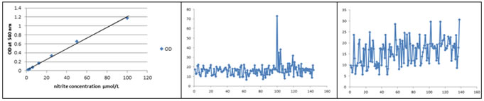 Figure 1 Figure 2 Figure 3 Figure 1: Standardization graph for nitrite; Figure 2: Scatter plot for serum nitrite levels among non smokers (n=144); Figure 3: Scatter plot for serum nitrite levels among smokers (n=138)