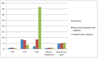 Table 2: Comparison of Serum TT3, TT4, TSH, Serum Creatinine, Serum Uric acid among Controls and Hypothyroid Subjects