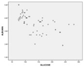 RESULTS AND DISCUSSION The Results of the study showed that the Fasting plasma Glucose levels were significantly [p<0.05] higher in Group 1 - Cases [177.63±44.45] when compared to Group 2 - Controls [91.76±11.77] (as illustrated in Graph 1) and on the contrary Serum albumin levels were significantly [p<0.05] lower in Group 1 – Cases [3.12±0.58] when compared to Group 2 – Controls [4.10±0.42] (as illustrated in Graph 2). Graph 1 Graph 2 Pearson Correlation Coefficient between Serum Albumin and Fasting Plasma Glucose levels showed significant negative [r = - 0.609] correlation at 0.01 level [2-tailed] (as illustrated in Graph 3) Graph 3 Albumin is a non-glycosylated protein of 585 amino acids. It is the most abundant protein in plasma accounting for more than 50% of plasma protein mass. Because of its high plasma concentration and medium size, albumin is the major contributor to colloidal oncotic pressure in the vascular space. This force helps to retain fluid within vascular space. Albumin is also the major protein component of most extravascular body fluids. Approximately 60% of total body albumin is found in the extravascular space. It is highly soluble in water because of its high abundance of charged amino acids. It has a net charge of-12 at neutral pH. Albumin is synthesized by hepatic parenchymal cells.3 The synthetic reserve is substantial and has been known to increase about three-fold above normal. The usual half-life of albumin is 15 to 19 days. Albumin has multiple functions including maintenance of colloidal oncotic pressure, binding and transport of many compounds including free fatty acids, bilirubin, calcium, thyroid and steroid hormones, drugs and maintenance of redox state of the extracellular milieu. Hyperglycemia has its effects on synthesis, redistribution, oxidative stress, protein glycation process, function and finally degradation of albumin. It affects circulating albumin concentration among patients with uncontrolled type II diabetes mellitus patients. Many studies have even concluded that lowered albumin concentration as a predictive risk factor for incidence of Diabetes Mellitus Type II which completes the vice versa effects of lowered albumin concentration and elevated plasma glucose levels among patients with type II diabetes mellitus.