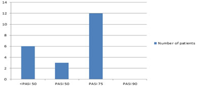 MATERIALS AND METHODS Patients and data collection The study was conducted at Department of DVL, Gandhi Medical College, Telangana. We included 21 patients affected by chronic plaque psoriasis aged >18 yrs and willing to participate in study. Apremilast was used following its prescription recommendations (start 10 mg/day, stepwise increase to 30 mg twice/day). All patients were recommended to use additional topical treatments. None of the patients received additional systemic antipsoriatic therapy. Patients did not participate in any other clinical trials and signed consent forms for the anonymized use of their data. The ethical committee of GMC approved the study. All patients were evaluated at predefined time points (week 0, 4, 8,12, 16, 20, 32 and 40). At each visit, the following data were noted - family history of psoriasis, joint involvement, previous psoriasis treatments, psoriasis area severity index (PASI) scores, and the onset and duration of adverse events (AE). Data analysis Treatment efficacy was evaluated by PASI50, PASI75 andPASI90, reflecting the improvement of skin lesions compared to PASI-baseline (PASI calculated at the beginning of treatment).26,27 Psoriasis severity was classified based on PASI as mild (PASI < 10) and moderate – severe (PASI ≥ 10).Cohort PASI scores were calculated for weeks 4, 8, 12, 16, 20, 32and 40. Descriptive statistics were used to express patient demographics and AE distribution. The variable selection was based on published literature.