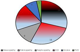 RESULTS In present study total 100 newly diagnosed patients of diabetes mellitus were studied. Out of that 54% were males and heart 46% were females. The mean age of the patients was 51.64 ± 9.51 years. Majority of diabetes patients were of 51-60 years (33%) of age. other common involved age groups were 41 to 50 years and 61 to 70 years. In present study most frequent symptoms were polyuria (24%), tingling numbness (18%) and polydipsia (14%) etc. (graph no 01). In present study 19% and 18% patients had diabetic neuropathy and diabetic retinopathy respectively. Other complication were ischaemic disease (13%), diabetic nephropathy (8%), cerebrovascular stroke (5%) and peripheral vascular disease (2%). (Graph no 02) Out of total patients 52% had normal BMI, 44% and 04 % patients were overweight and underweight respectively. The mean BMI of the patients was 25.02 ± 3.33. Out of 56 males 21.42%% males had high waist hip ratio (WHR>01) while out of 44 females 54.54% had high waist hip ratio (WHR>0.85). The average waist hip ratio of all participants was 0.89 ±0.09. Positive family history of diabetes mellitus was seen in 20% male and 15% female patients. Clinico-investigative profile of all patients shown in table no 01. Mean fasting blood sugar (FBS) levels among patients having diabetic retinopathy and not having retinopathy were 358.44±43.07 and 239.09±85.64 respectively. Among diabetic nephropathy and non-nephropathy patients mean fasting blood sugar level was 352.75±47.44 and 252.55±90.55 respectively. Patients of having diabetic neuropathy also has higher mean fasting blood sugar level (343.85±75.0) than non-diabetic neuropathy patients. In all there group’s statistical significant difference was seen in fasting sugar level. (Table no 02) Among diabetic nephropathy and non-nephropathy patients mean post prandial blood sugar (PPBS) level was 475.13±45.30 and 278.63±61.79 respectively. Mean post prandial blood sugar level was higher in patients having diabetic retinopathy (365.11±63.02) than non-retinopathy (278.81±76.06) patients. In diabetic neuropathy patients mean post prandial blood sugar level was 337.30±60.34 while in non-diabetic neuropathy patients it was 283.61±81.96. PPBS levels were found to be statistical significant among patients having diabetic complication and not having complication. (Table no 03) Mean HbA1C level among patients having and not having diabetic retinopathy was 10.52 ± 1.77 and 8.67 ± 1.53 respectively. Among diabetic nephropathy patients mean HbA1C level found to be higher (10.84±1.79) than not having nephropathy (08.84±1.63). In diabetic neuropathy patients mean HbA1C level was 10.41±2.04 and not having neuropathy it was 08.65±1.45. The difference of mean HbA1C level found to be statistical significant. (Table no 04) Among patients having tingling numbness and not having numbness; difference among FBS level, PPBS level and HbA1C level found to be non-significant (Table no 05). Patients having blurring of vision and not having blurring of vision; difference of FBS level and PPBS level found to be statistically significant while difference of HbA1C level found to be not significant. (Table no 06). Pearson’s correlation test between HbA1C level and lipid profile found to be not significant. (Table no 07)