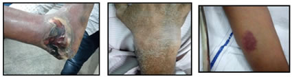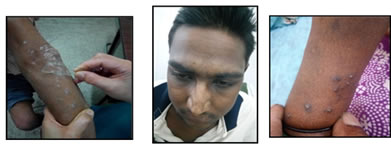 Oral mucosal changes were seen in 18 patients (18%), with most common finding being macroglossia and stomatitis each in nine patients (9%), coated tongue and candidiasis were seen in five patients (5%) and one (1%) patient respectively. 5 patients (5%) had more than one oral mucosal finding. Other skin lesions that were seen in our study in the CKD patients included – perforating disorders-two cases (2%), calciphylaxis in one patient (1%), Uremic frost in two (2%) patients, bullous dermopathy in one (1%) patient, psoariatic lesion in one patient (1%), malar rash in two (2%) patients. Photographs showing cutaneous lesions in CKD patients a. Bullous dermatosis b. Xerosis c. Purpura d. Psoriatic lesion e. Hyperpigmentation f. Kyrle’s disease