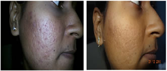 Abstract Background: There are various treatment modalitieslike chemical peeling, subcision, laser resurfacing with CO2 laser, ErYAG laser are available for treatment of acne scars. Ablative lasers are most effective but associated with drawback of hyperpigmentation in type IV and V i.e. Indian skin types. The fractional radiofrequency (FRF) system have reported to cause dermal regeneration with minimal epidermal changes.This study was designed to assess efficacy of FRF in treatment of acne scars. Aims: This study is to asess efficacy of FRF for treatment of acne scars. Methods and Material: Thirty-one patients with acne scars received three treatments with FRF at the interval of 4 weeks. Acne scar assessment was done with Goodman and Baron’s grading (GBG) and Echelle d’Evaluation Clinque des cicatrices (ECCA) system on pre and post treatment photographs taken at first visit and one month after the last treatment. Statistical analysis used: Wilcoxan signed rank test. Results: The results were assessed quantitatively by GBG showed improvement of 23 (63.8%) patients from grade 3 to grade 1 and 6 (75%) patients from grade 4 to grade 2. Thus 20 patients (64%) patients showed improvement by 2 grades. Median GB score improved from 18 to 8 and median EACC score improved from 45 to 20 after the treatment which are statistically significant on applying Wilcoxan signed rank test.No significant adverse effects like post inflammatory hyperpigmentation were seen. Conclusions: FRF is effective for treatment of moderate to severe acne scars. Key words: fractional radiofrequency, acne scars, lasers, non-ablative lasers.