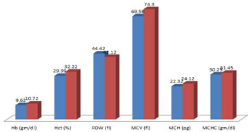 OBSERVATION AND RESULTS Table-1and Graph-1 shows comparison of haematological profile in simple FS and control group. In FS group mean Hb (gm/dl) value was 9.62 (SD±1.50) and in control group was 10.72 (SD±1.40) t test value was 6.50, (p<0.01). Mean Hct(%) value of FS group was 29.39 (SD±4.02) and in control group was 32.22 (SD±3.60) t test value was 6.42,(p<0.01). Mean RDW(fl) value in FS group 44.42 (SD±2.60) andin control group 42.12 (SD±3.14) t test value was 6.91, (p<0.01). Mean MCV (fl) value in FS group was 69.58 (SD±5.90) andin control group was 74.30 (SD±6.90) t test value was 6.36, (p<0.01). Mean MCH(pg) value in FS group was 22.32 (SD±3.20) and in control it was 24.12 (SD±3.05) t test value was 4.98 , (p<0.01). Mean MCHC (gm/dl) value in FS group was 30.25 (SD±2.12) and in control group was 31.45 (SD±1.30) t test value was 5.91, (p<0.01). Table-2and Graph-2shows comparison of serum ferritin (ng/ml) in both groups, mean value in FS group was 40.8 (SD±19.2) and in control group it was 65.92 (SD±9.6) t test value was 9.6, (p<0.01).