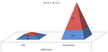 DISCUSSION In the present clinical assessment of Fetal Malnutrition (FM) in Andhra Pradesh population. The CAN study assessment 12 (4%) hair, 6 (2%) Cheeks, 4 (1.3%) Neck and Chin, 3 (1%) parameters of legs like arms are similar, 4 (1.3%) Back, 4 (1.3%) Buttock, 4 (1.3%) Chest, 2 (0.66%) Abdomen. (Table-1). In AGA group – 16 (5.3%) were FM, 169 (56.3%) were nourished. In SGA group – 75 (25%) were FM, 40 (13.3%) nourished, (Table-2). In the comparison of PI (<2.2) and CAN score – 19 (6.33%) were FM, 66 (22%) were nourished. In PI (>2.2) and CAN score – 20 (6.6%) were FM, 165 (55%) were nourished (Table-3). Mean birth weight was 2.74 kg (SD±0.38), Mean length was 48.9 cm (SD±1.89) mean circumference was 34.09 cm (SD±0.3) These findings are more or less in agreement with previous studies (5) (6) (7) It was reported that majority of the FM infants with handicaps including spastic diplegia, seizures, visual problems, learning disabilities or mental retardation (8). Moreover about three fourths of neonates with FM death occur in first week of life (9).The root cause of FM is poverty and illiteracy mainly in rural part of India and neonates born in these populations are expected to be the vulnerable to FM, morbidity and mortality (10). Ponderal Index relies on principles of length is spared at the expanse of weight during period of acute malnutrition.