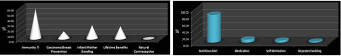 Practices of the study participants Advantages known to mother regarding Breastfeeding Figure 2 Figure 3 Ways known to mothers to increase breast milk secretion. When counseled individually, 85.27% developed positive attitude to receive milk from Human Milk Bank if not breastfed and 87.37% agreed to donate milk to Human Milk Bank for the benefit of neonates as a good service to the society. Individual counseling helps to improve the breastfeeding myths and improper practices in the society.